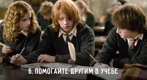Гермионе не жалко делиться знаниями — она с готовностью (которую некоторые её однокурсники скорее бы назвали «настырностью») объясняет отстающим ученикам материал и помогает с домашними заданиями. У Гермионы жёсткие принципы: она не соглашается делать задания за кого-то и не даёт списывать. Но часто выручает Рона и Гарри, разрешая им читать свои конспекты и проверяя их работы. Пожалуй, это правильная тактика для отличника, который не против помочь другим, но не хочет, чтобы ему сели на шею.